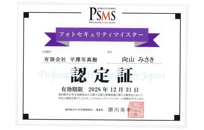 当社は、写真に関する安全管理とプライバシー保護の専門資格「フォトセキュリティマイスター」の認定を取得しております。